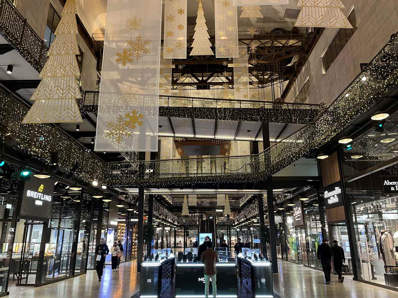 I first visited on a summer’s day before the complex was fully open, so I made a return visit on a December afternoon to sample the finished product, soak up the Christmas spirit, and ride The Chimney Lift to the top of the north-west tower after dark. Arriving from the Underground station, I was instantly wowed by the floodlit towers against the night sky and the glorious golden Christmas tree at the entrance.