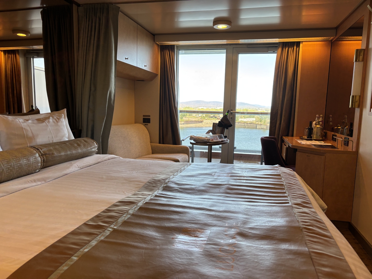 I have to admit being distracted by the Cake Me Away celebration in Lido Market, 17 varieties to choose from, as many as you could eat, all free – I stalled after sizable slices of Mocha Praline and Salted Caramel. Then a late afternoon session under the warm sun in an on-deck hot tub, with more views, before a glass of wine on the balcony of my warmly wood-toned room.