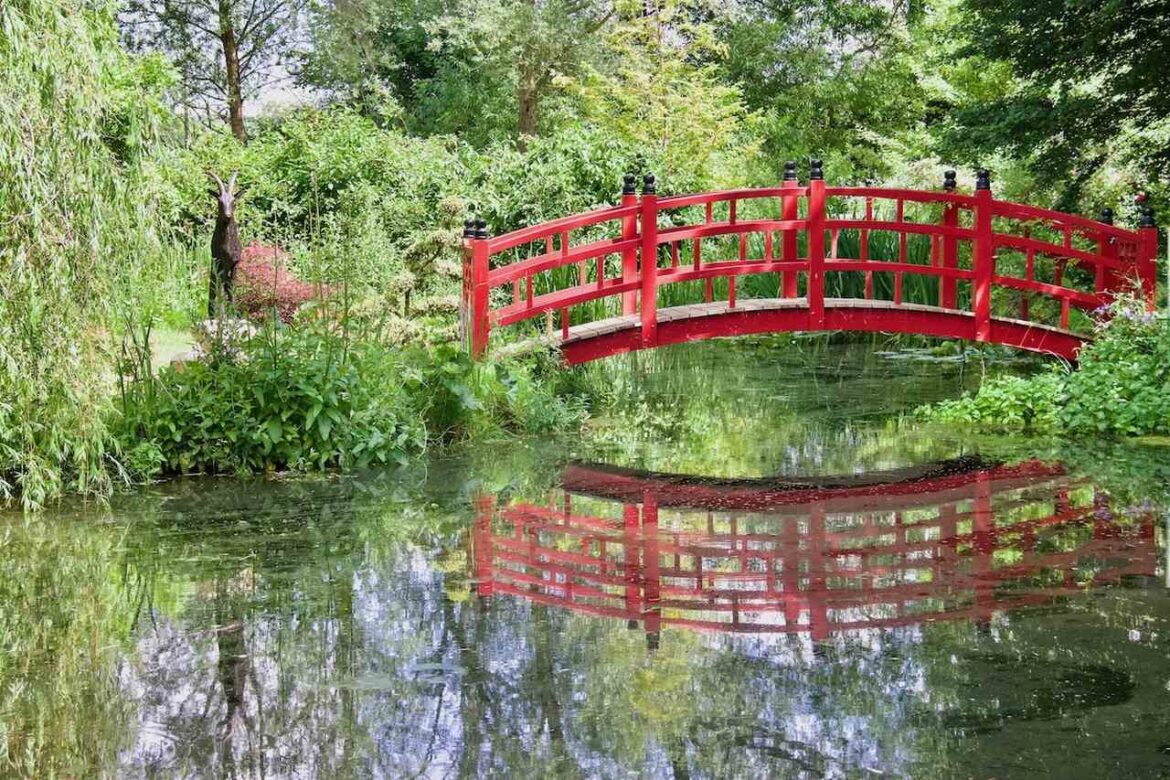 At one end of the herbaceous border is the new Oriental Garden which includes some traditional Japanese architecture – a Torii, Moon Gate and Nikko bridge. Beside the bridge is the sculpture of a triumphant goat and on the far side of the stream that feeds into the little lake is a dejected deer.