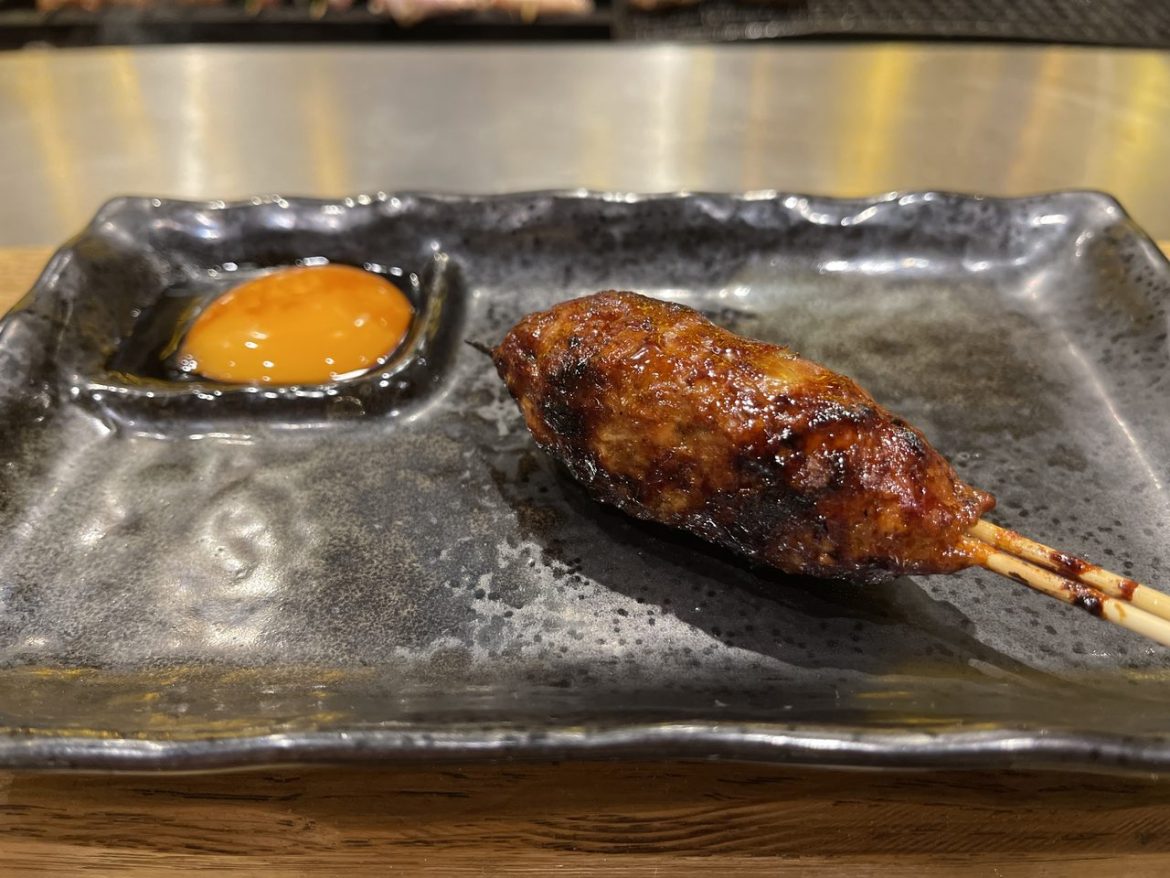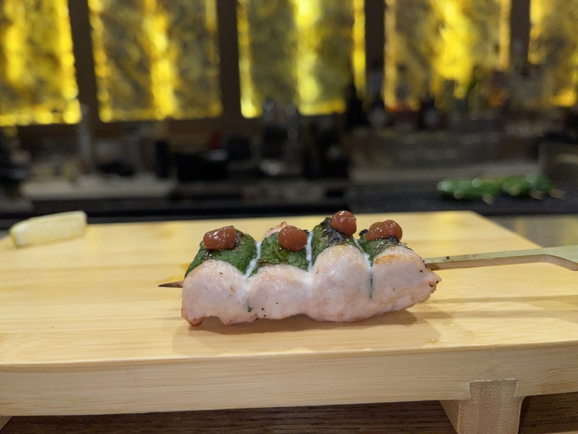 We started with an Amuse Bouche of charred cherry tomato with chilli miso – two glorious mouthfuls followed by six chicken skewers. These were Momo, chicken thigh with 50 year-aged tare sauce, Tebasaki, a chicken wing, chicken oyster, Shiso Maki, a chicken breast with shiso leaf and house-made ‘ume’ plum paste and Sasami, a chicken tender with wasabi