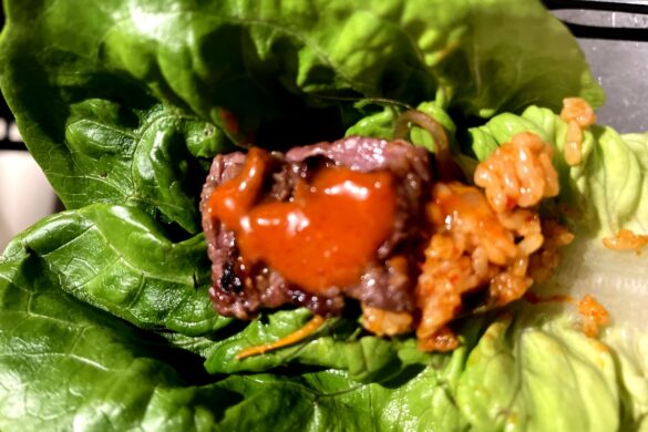 So the optimum way to cook is to char one side and then flip to char the other side. Once the meat was cooked we cut the meat into small pieces with the scissors they provided and then added generous slivers of meat and roasted vegetables to Ssam – lettuce and perilla leaves – added sauce, kimchi, and rolled. Sauces were added to taste, a little rice, and just we just ate.