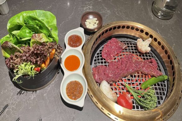 Then the main course arrived with Sot bab, a bowl of rice cooked in a clay pot. KGK King Kalbi short rib beef – the signature dish – marinated in their signature sauce ready to be put on the bbq. The grill was turned on and greased. Then the meat and vegetables placed onto those hot red rings and cooked.
