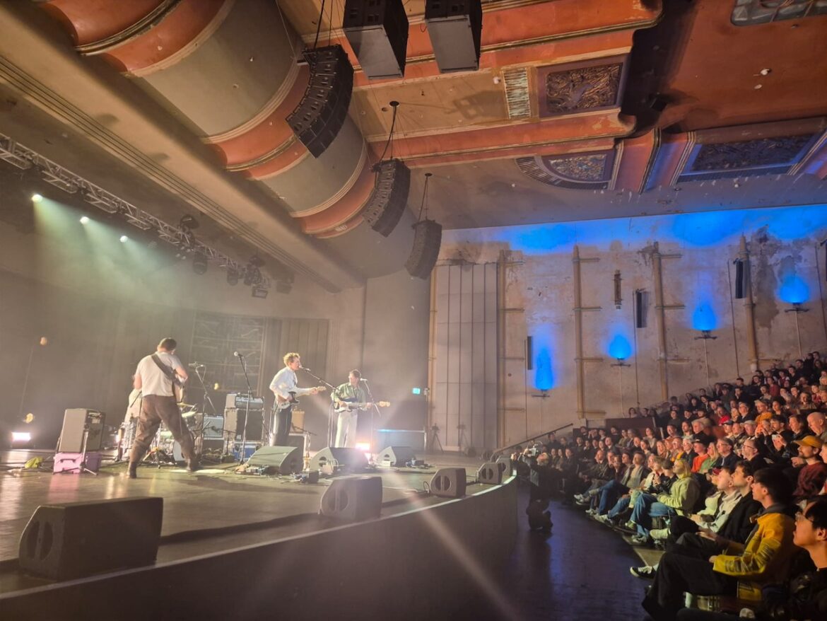 His band -drums, bass, guitar- cluster tightly mid-stage, playing with loose, almost homespun precision. They move like a unit that trusts the songs to hold, even when they threaten to drift. Opener “Gasoline” (teased rather than announced) arrives in a low, easy sway before blooming outward, setting the tone for a set that resists any obvious peaks. Instead, it accumulates with small shifts, subtle pivots, a groove settling in and refusing to leave.