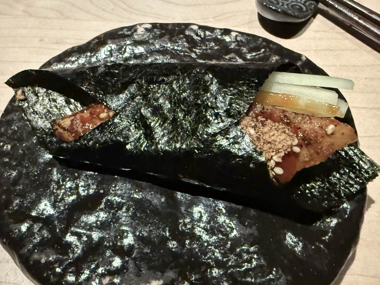 The penultimate dish was Wagyu A5 Nigiri, very thin slices of wagyu seared on a round slab of Himalayan rock salt to preserve its rich, buttery flavour and served with shallot ponzu.
