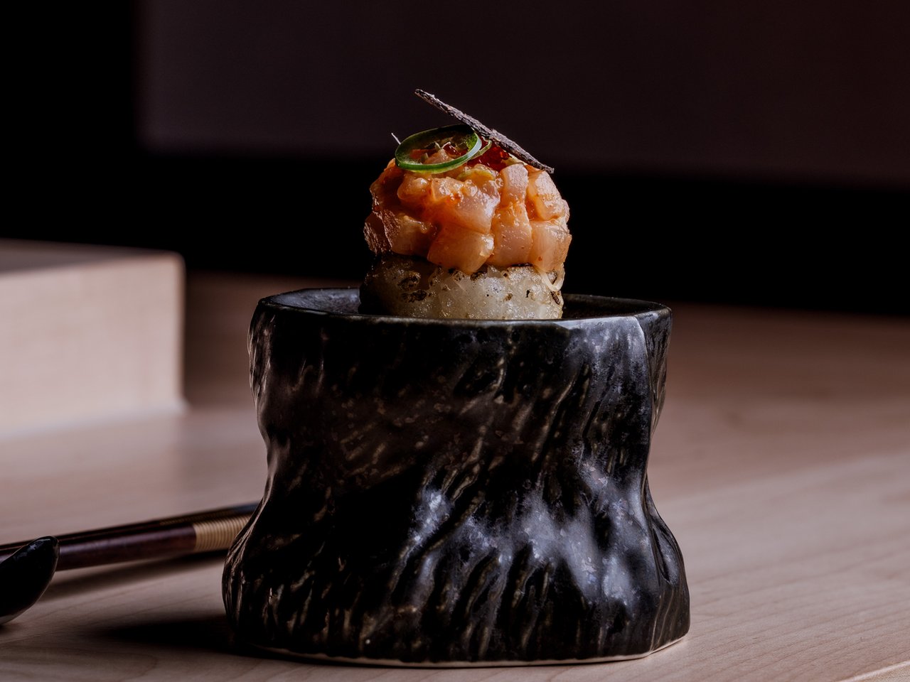 The tiny Luna Omakase restaurant is tucked away on the ninth floor of the Los Mochis London City. Unlike its noisy host, Luna Omakase is a highly intimate and immersive experience.