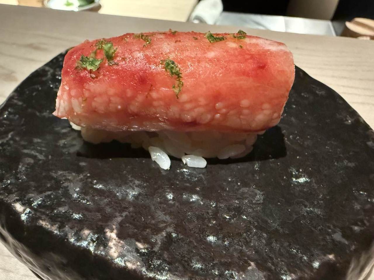 There were some eyebrow-raising moments, for instance, when the Nasu Toro Nigiri, belly of sea trout nigiri, was blow-torched in front of us; it was quite the show. Then the chef handed it to us and instructed us to eat it with our fingers, placing it into our mouth upside down so the fish was on the palate first.