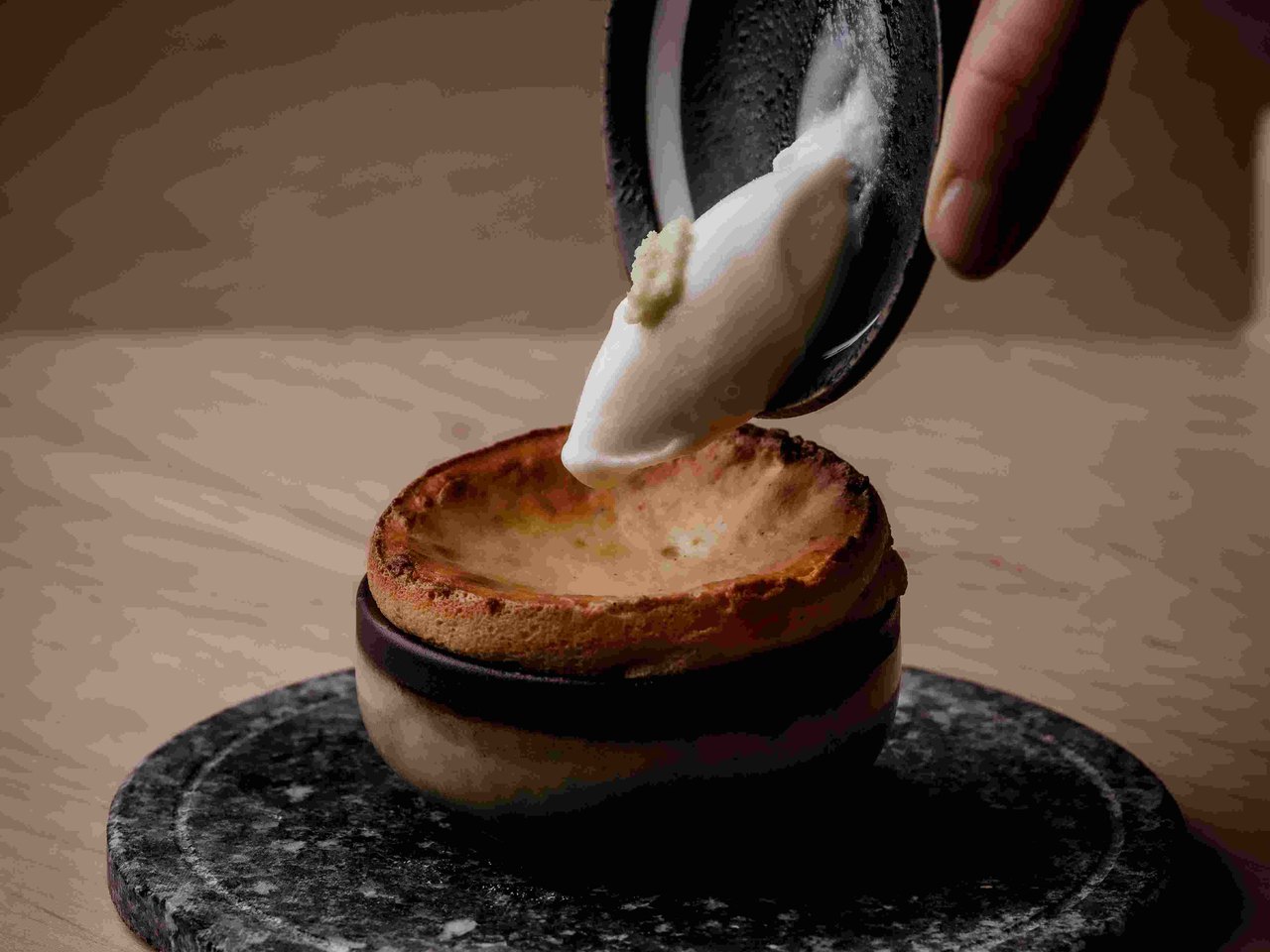The desserts were pretty sensational. We watched as the chef minced a block of crisp and naturally sweet blood orange and camomile granita into flakes, which he said “would immediately disappear but leave the flavour”. This was followed by a hot soufflé, with miso caramel and fresh wasabi ice cream providing a sensational combo of flavours and temperatures to round off the evening.