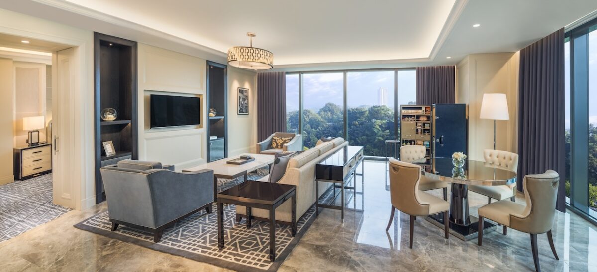 The rooms are vast by almost any urban standard, with entry-level rooms beginning at around 63 square metres. Floor-to-ceiling windows frame views over the greenery of the nearby Lake Gardens and the expanding geometry of Kuala Lumpur beyond.
